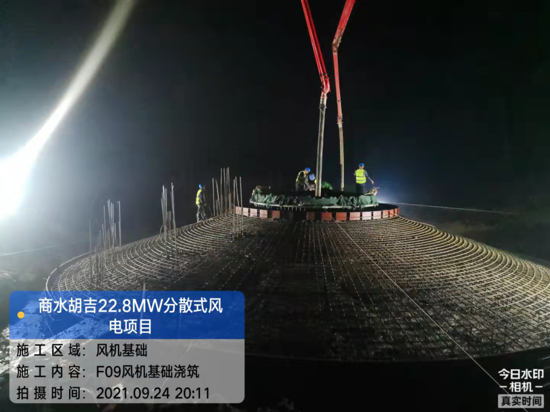 2021年9月25日2时30分,商水胡吉22.8MW分散式风电项目首台风机基础浇筑工作顺利完成,该工程的完成标志着商水胡吉22.8MW分散式风电项目施工已进入高峰阶段。